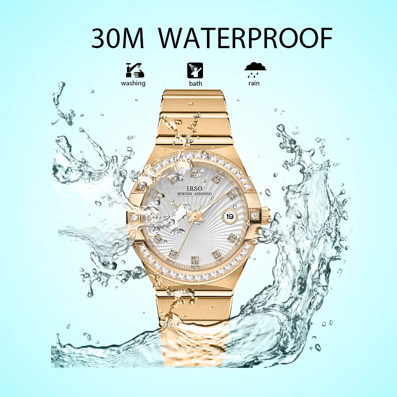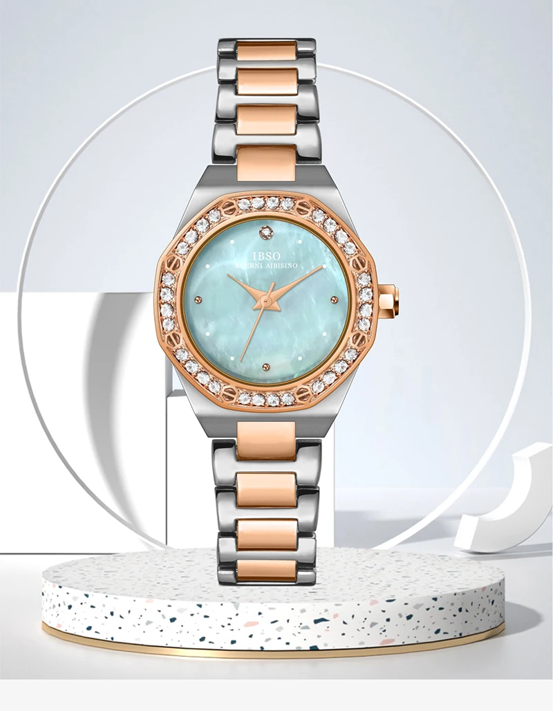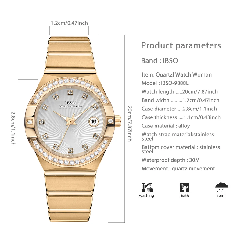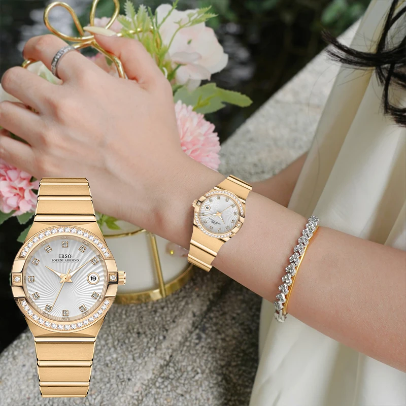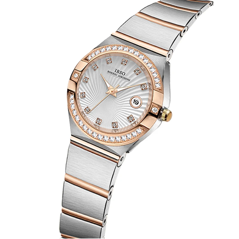 Description: Round IBSO Quartz Watches for Women Steel Band with Push Button Hidden Clasp Lady Hand Clock with Hardlex